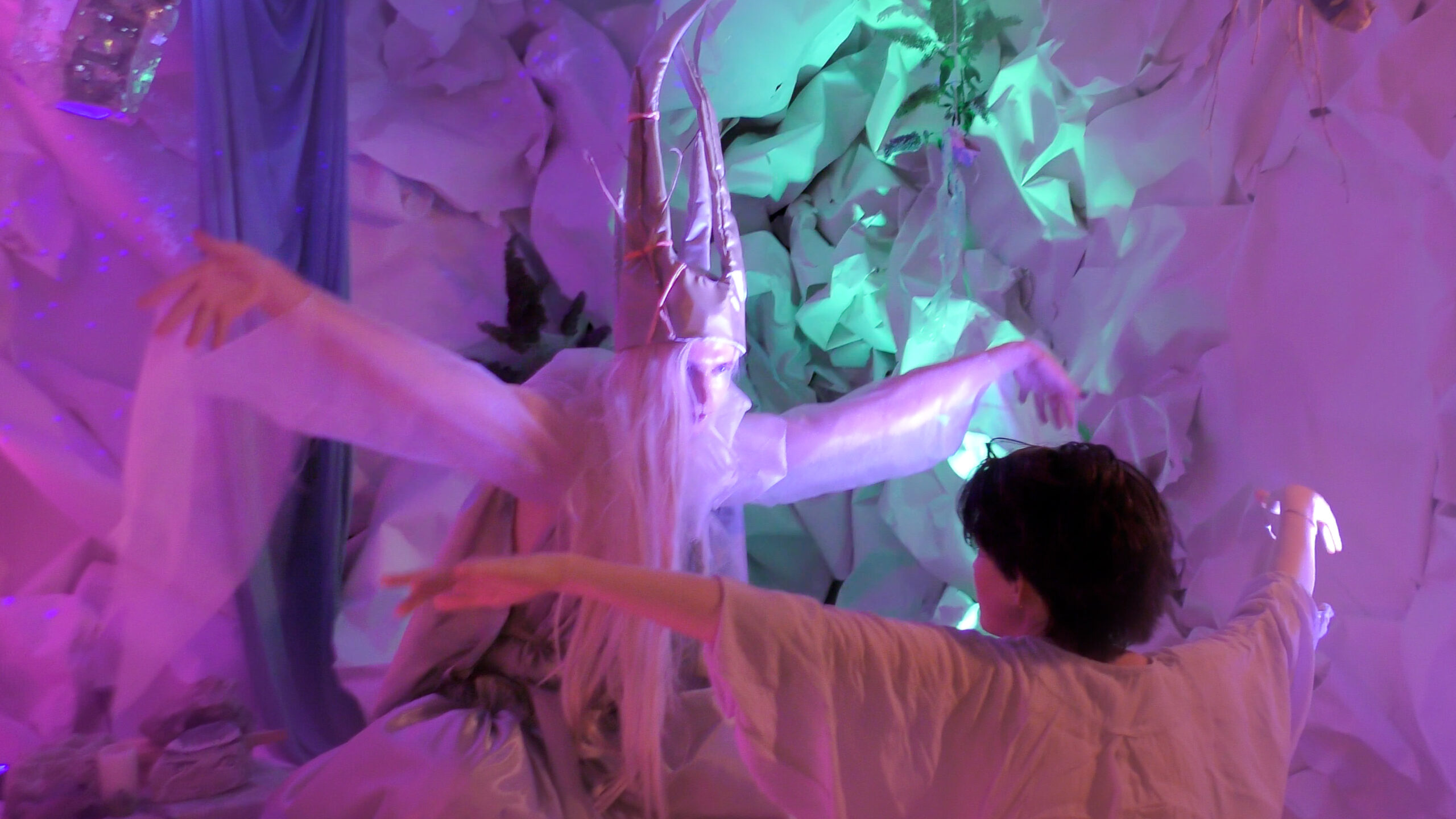 The music video was the collaborative creation of Staying Out Collective. The world below the flowers came to life in a kitchen in Surbiton with very little budget and reams of paper. Set designed by Lettice Drake (who also plays one of the bad-booshkas). Lyndon Harrison, Jess Wear and Robbie Ellen helped create and build the set as well as playing the fellow bad-booshkas and tree people. The Fairy Queen costume was designed and made by Fiontasia. All other costumes were mostly improvised the day before the shoot, guided by a united aesthetic, and years of dressing up together. Josh Grigg on lighting and lasers. John De Lima behind the camera. Fernanda Munoz-Newsome guiding movement and group choreography. Ed Webb-Ingall as the essential chief wrangler. Ines Maria Krämer on well being. Lucy Duncan (Luki) directing, playing the hapless human and editing the film into its final form.